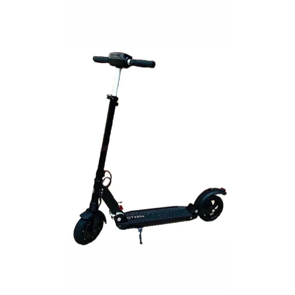 Потрясающий складной электросамокат GT 350S весом 11 кг способен разгоняться до скорости 30 км/ч , а его одного заряда хватает на 3-4 часа, что составляет примерно 25 км. За счёт своего веса и способности принимать компактный размер, его можно брать с собой куда угодно. Кроме того, он достаточно устойчивый, благодаря наличию подножки.Аквазащита поможет избавиться от неприятностей, в случае непредвиденных погодных условий или других обстоятельств, а колеса прикрыты крыльями, что предотвращает забрызгивание ездока. Амортизаторы помогут преодолевать даже дороги с неровностями. Руль способен подстраиваться под рост ездока, так что электросамокат идеально подойдет как для ребенка, так и для взрослого. На руле расположен бортовой компьютер с ярким дисплеем, на ней отображаются такие показатели как: Скорость; Заряд аккумулятора; Пробег; Температура; Подсветка; Индикатор тормоза. С левой стороны от дисплея установлен рычаг газа, а справой рычаг тормоза. Между рычагами находятся кнопки управления дисплеем: кнопка для подачи звукового сигнала, кнопка выключающая и включающая фару и, конечно, кнопка питания.