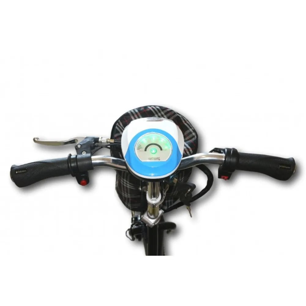 В наличие яркая фара, на рулевой стойке информационный дисплей позволяющий вести контроль за скоростью и количеством заряда батареи. Еще есть сумка, закрепленная на стойке.