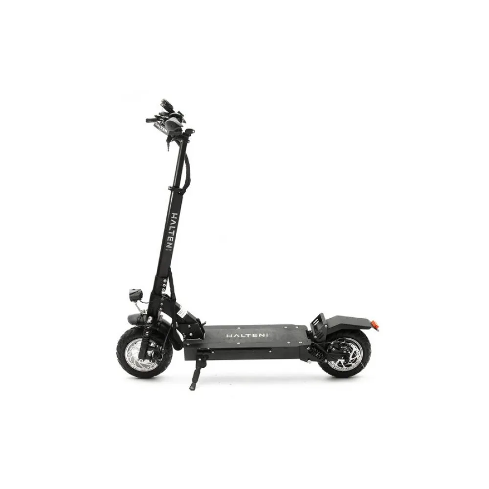 Halten RS-02 станет отличным помощником в передвижении на дальние расстояния, будет без проблем преодолевать участки бездорожья. Диаметр колес 10 дюймов. Его мощности в 1200 Вт хватит, чтоб спокойно подниматься на подъем 20 градусов. Скорость, которую развивает самокат на электротяге составляет 55 км/ч.