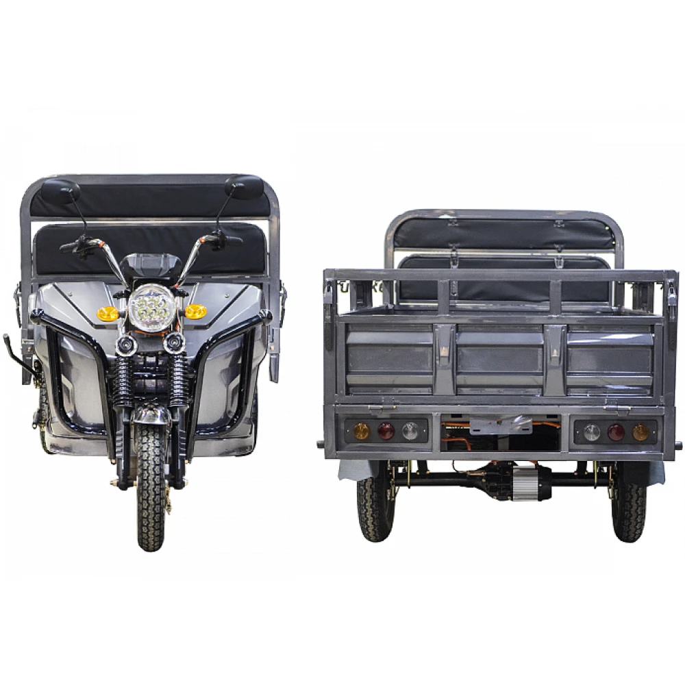 Грузовой электротрицикл Rutrike D4 NEXT II 60V1500W синий – мощная техника в презентабельном дизайне моментально привлекает внимание представителей бизнеса и фермеров. Объемный багажник, вместительное виденье, лучшие параметры удобства и комфорта заставляют внимательнее присмотреться к техническим характеристикам. Наш интернет-магазин предлагает купить электротрицикл по разумной стоимости. Каждому покупателю гарантирована бесплатная консультация, помощь в оформлении заказа. Модель оснащена мощным движком на 1500 Вт, который в сочетании с емкой батареей (от 55А*ч) обещает максимальный разгон до 25 км/час, которого хватает на преодоление дистанции до 80 км. Производитель обращает внимание, батарея не входит в комплектацию. Купить АКБ, подобрать максимально совместимую можно благодаря нашему интернет-магазину. Из других преимуществ производитель выделяет максимальную оснащенность функционалом. Техника оборудована зеркалами заднего вида, гидравлической амортизационной подвеской, информационным дисплеем. Имеется дополнительное место для пассажира. Широкая платформа для ног в сочетании с сиденьем исключает дискомфорт и проблемы с позвоночником. Широкие колеса (переднее х заднее - 3,50-R12 х 4,00-R12) отлично сцепляются с грунтом. Вместительный кузов размерами 3270 x 1200 x 1450 ДхШхВ – настоящая находка для предприимчивых личностей