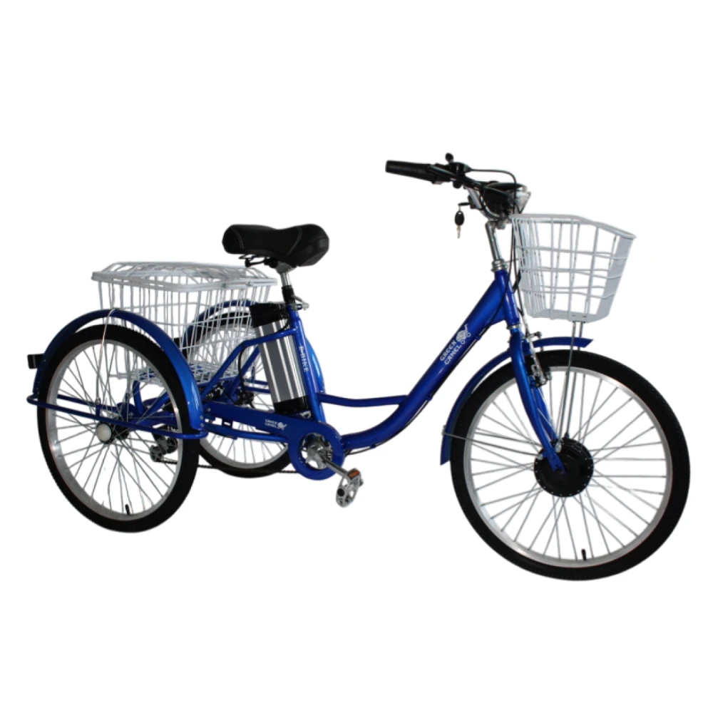 GreenCamel Трайк-24 V3 — трёхколёсный электровелосипед-трицикл для стабильных городских поездок, доставки или отдыха. Низкий центр тяжести обеспечивает устойчивость, максимальная скорость 25 км/ч, нагрузка 150 кг, пробег до 40 км. Идеален для тех, кто ценит безопасность и простоту.